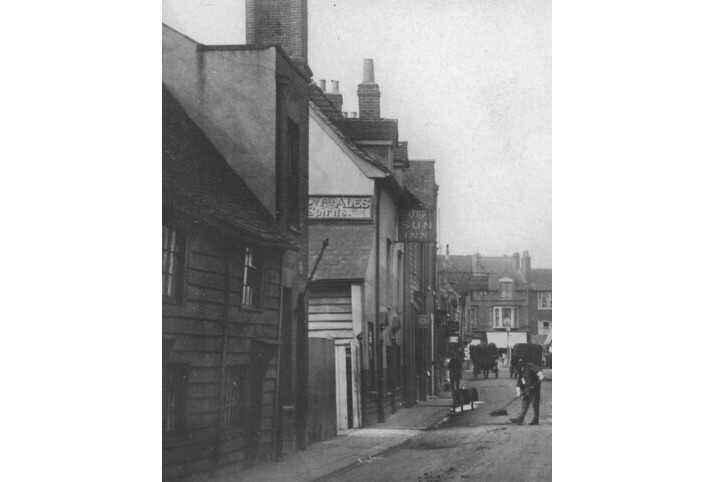View from middle of Sun Street, looking west. In the centre is the Sun Inn, which gave it's name to Sun Street. Further along is the White Lion Public House with Market Square houses in the background.
